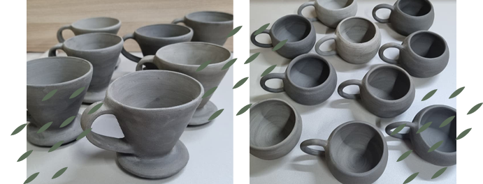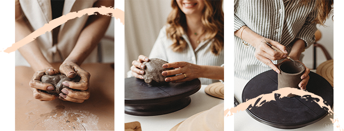 A partir daí, podemos começar a modelar nossa peça. Algumas peças usam técnicas de modelagem 100% manuais, e outras são modeladas a partir do girar do torno, onde o movimento ganha formas. No momento da modelagem, o corpo da peça começa a se formar. A criatividade toma conta, nossas digitais são a nossa assinatura, e cada peça formada é única.