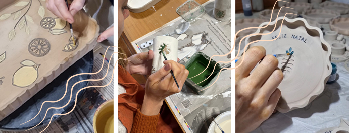 Com a peça cerâmica em mãos, seguimos para a etapa da esmaltação. As cores dão vida a peça. Os esmaltes são aplicados respeitando as demãos necessárias. E com a peça esmaltada, podemos então seguir para a segunda queima no forno.